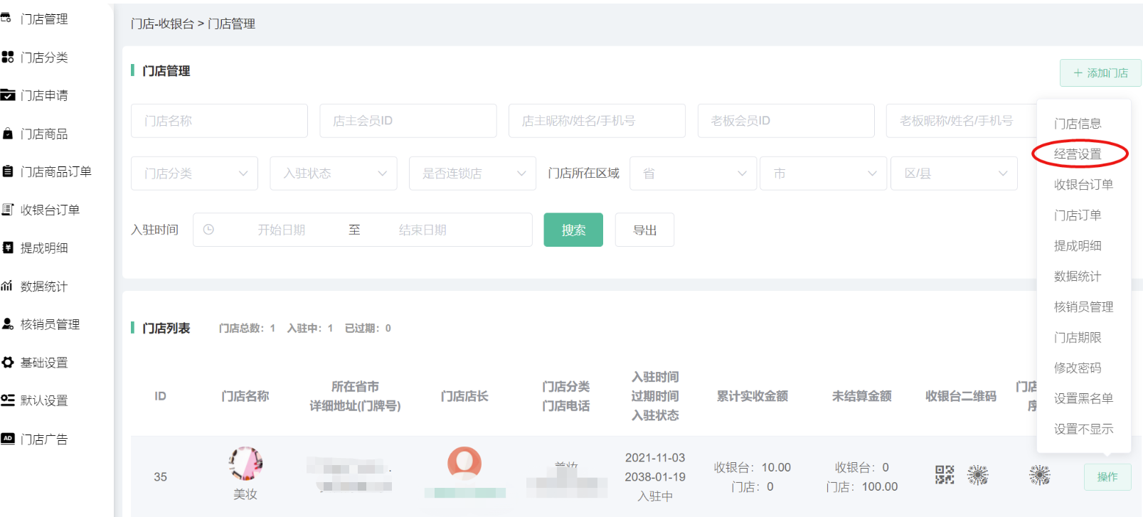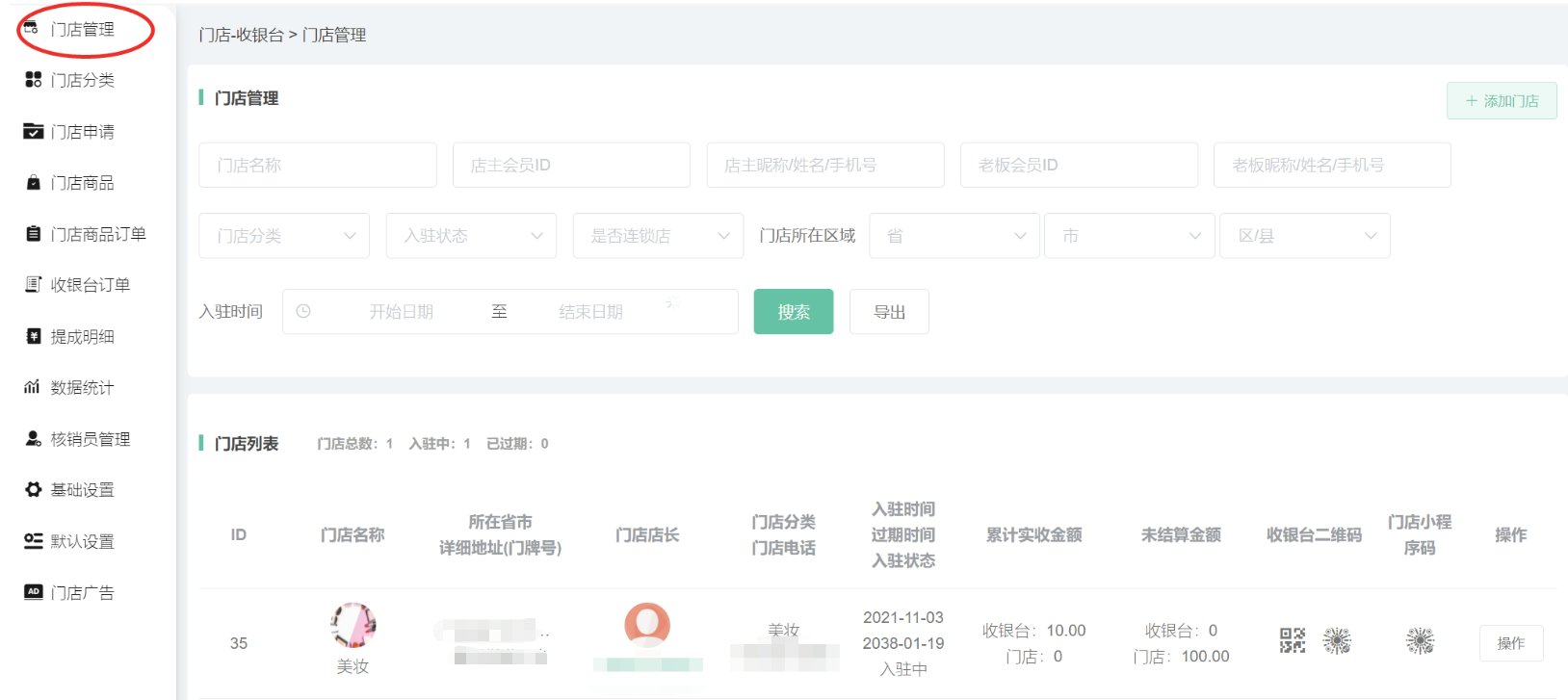 申请通过/后台添加的门店,在门店信息显示,可搜索查看门店的id、名称、所在省市详细地址、门店店长、门店分类、入驻时间、累计实收金额、未结算金额、收银台二维码、门店小程序码等