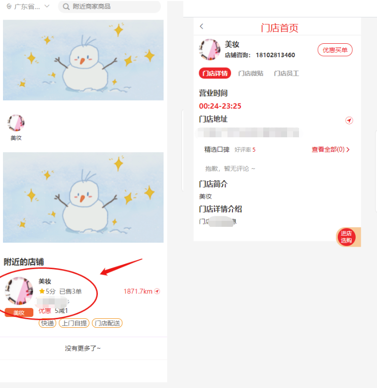 不显示:门店聚合页面中没有该门店信息。会员点击门店商品链接可以进入购买